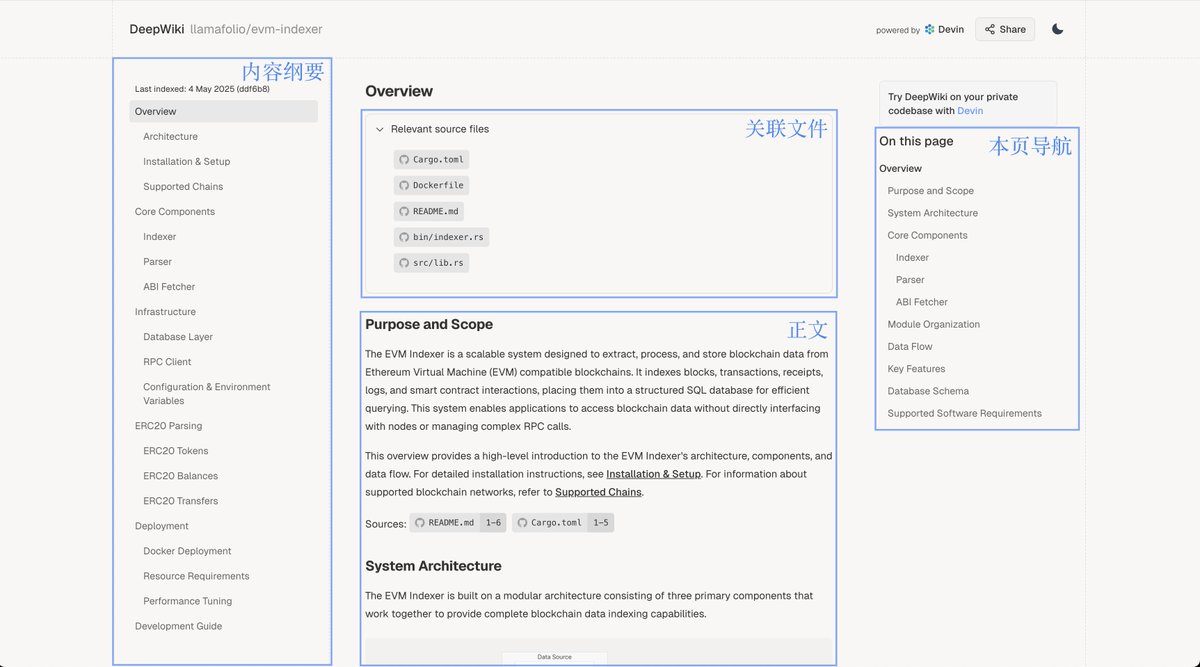 DeepWiki贴心的将内容纲要分成了如下几部分: