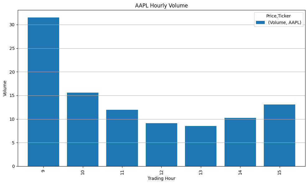 分析AAPL的日内交易量分布模式,下载2023年1月的苹果股票小时级数据,计算每个交易小时的平均成交量占比,并以柱状图形式展示: